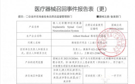 國家藥監局官方網站發表一則關於雅培醫療器械對產品進行召回的?雅因系改變公告