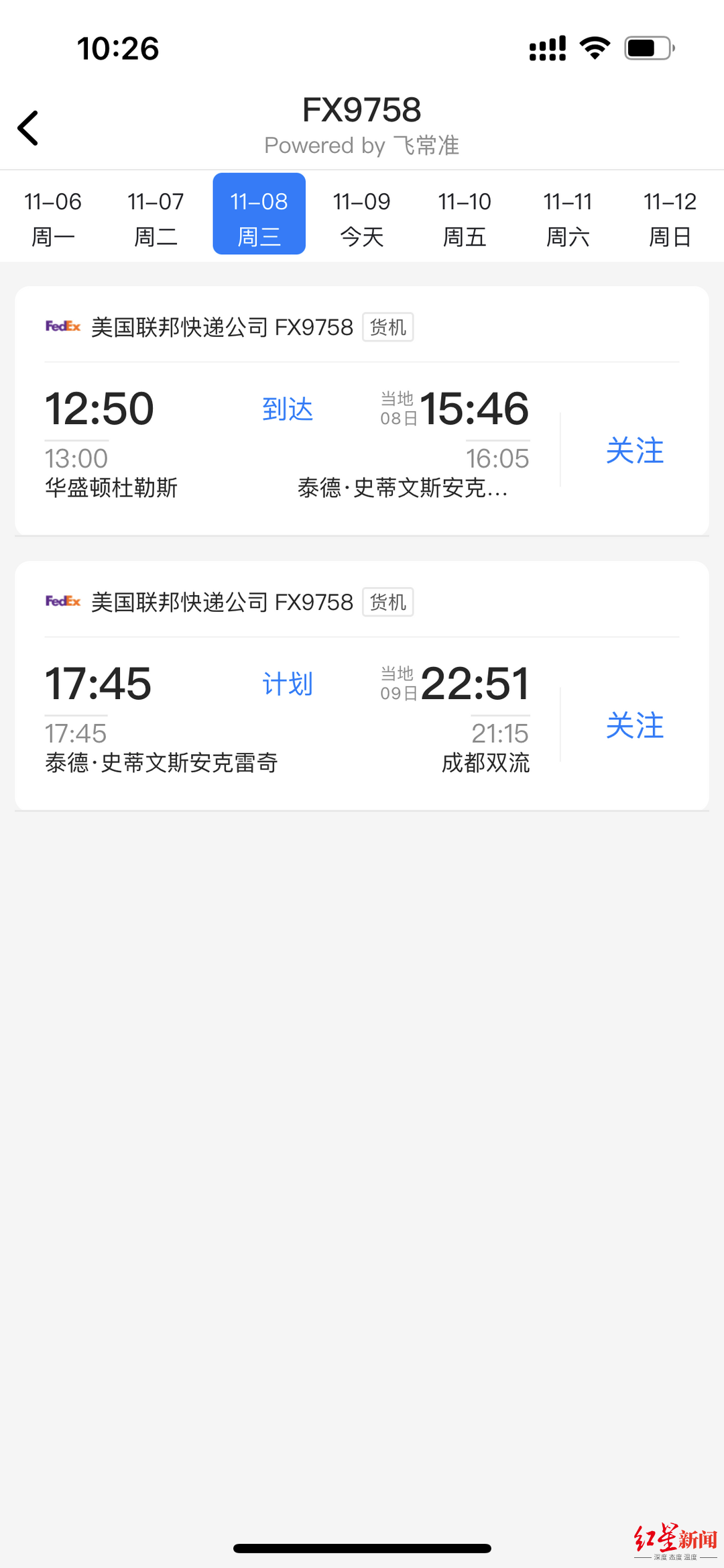 紅星新聞記者通過飛常準了解到 ,美香然後將於北京時刻11月9日21:15抵達成都雙流機場。旅美實踐抵達時刻或許會有推遲。大熊抵达